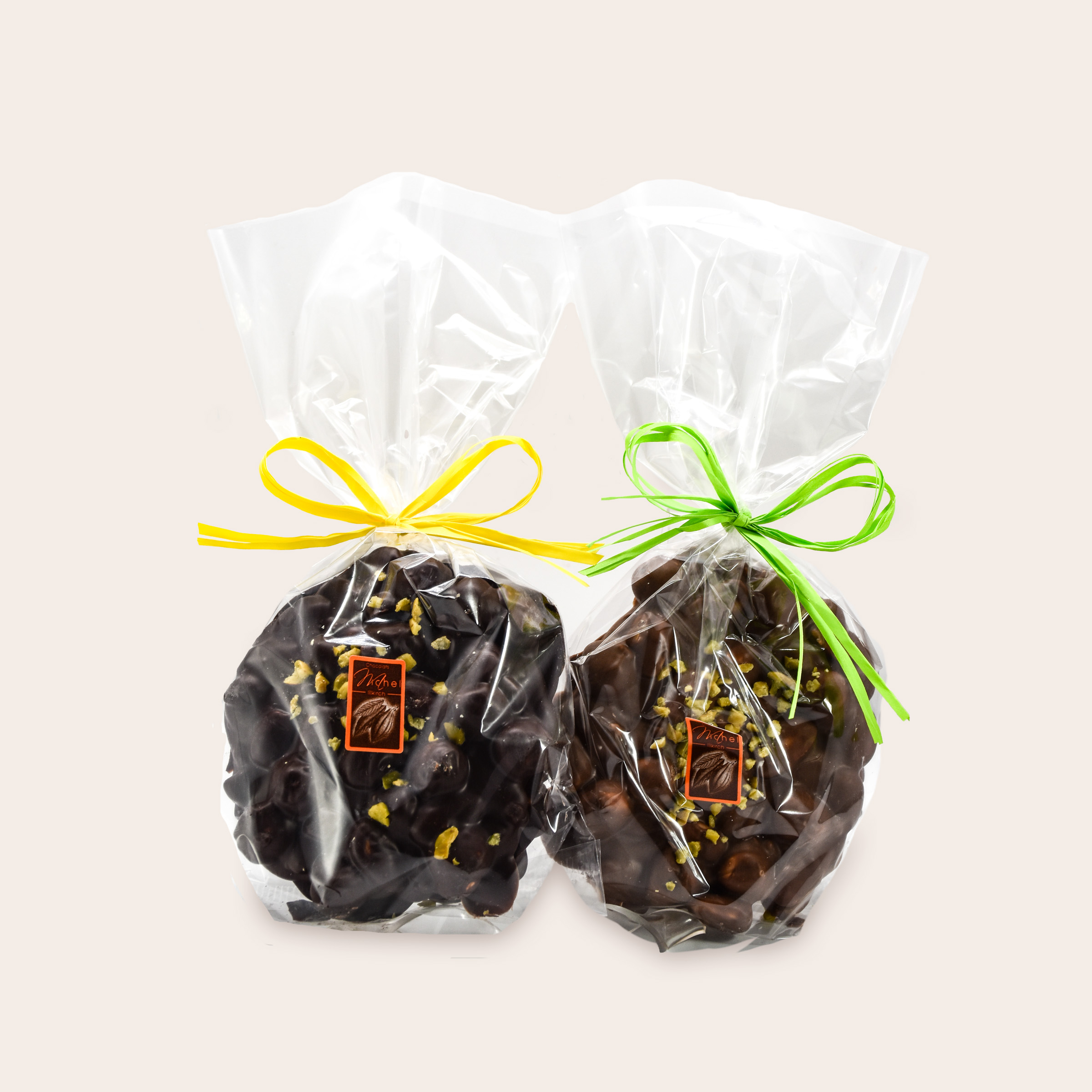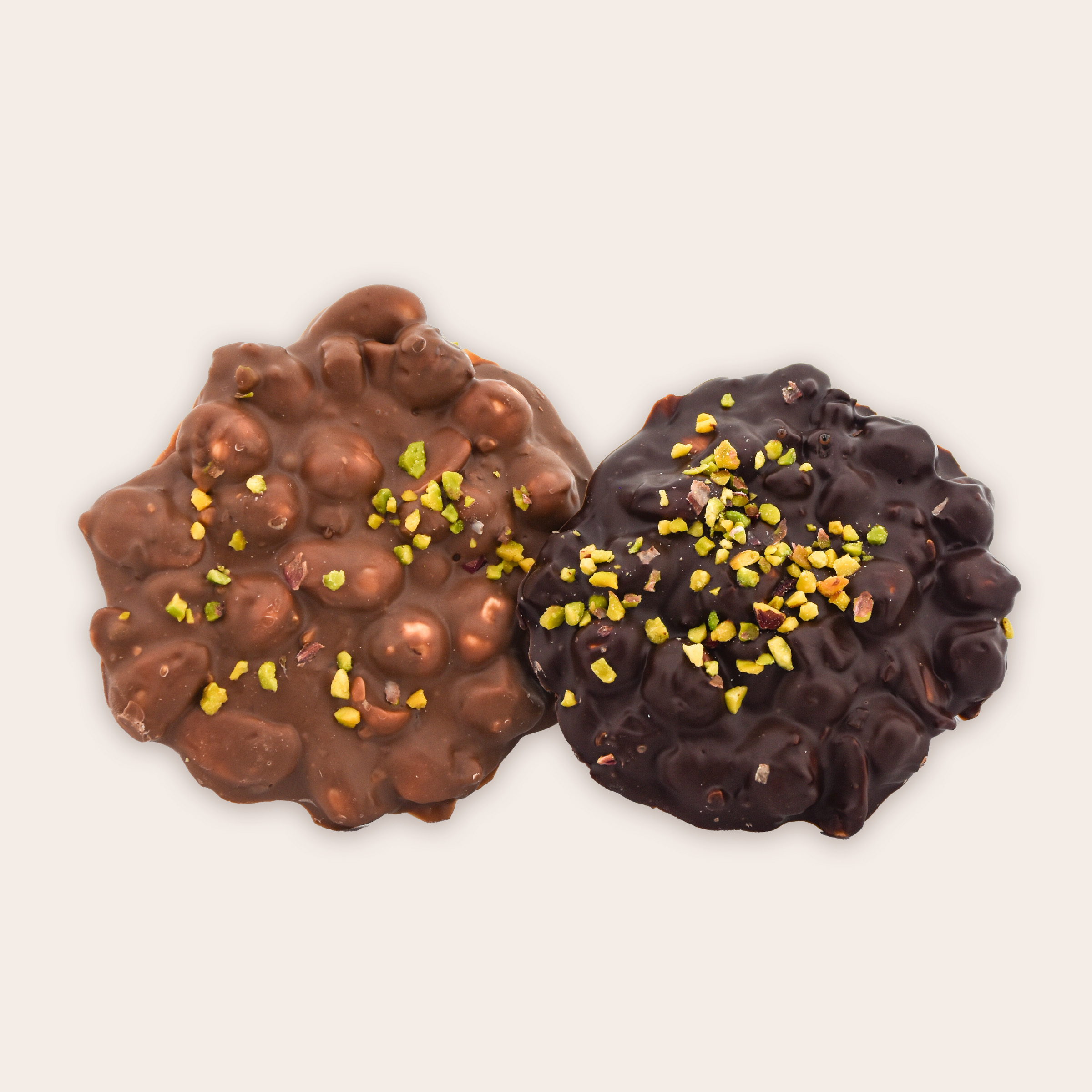 Du chocolat, des noisettes, des amandes, des pistaches et des écorces d’orange réunis dans un palet généreux et croquant.