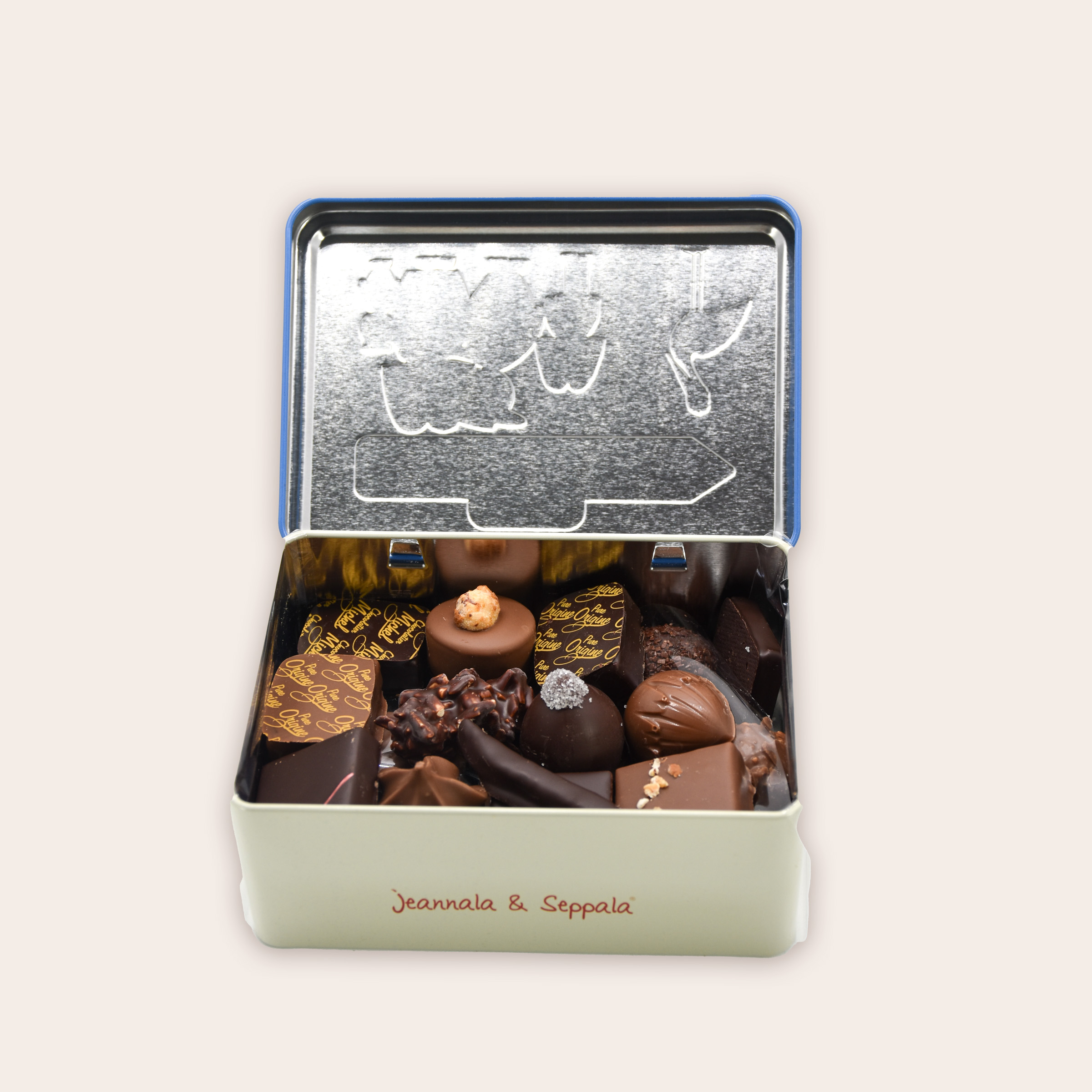 Sucre, pâte et beurre de cacao, noisette, poudre de lait entier, amande, orange confite, beurre, pistache, sucre inverti, alcool, dextrose, sorbitol, miel, pulpe de fruits, crème, sirop de glucose, café spéculoos, crêpe dentelle (blé-malt d’orge), arachide, sésame, riz soufflé, noix , noix de coco, émulsifiant, lécithine de soja, épices, vanille naturelle, arôme, gluten, colorants : extrait de carthame, carmin, bêta carotène, carmin d’indigo, bleu brillant FCF, E172. Peut contenir des traces d'arachide, gluten, fruits à coques.Conservation :