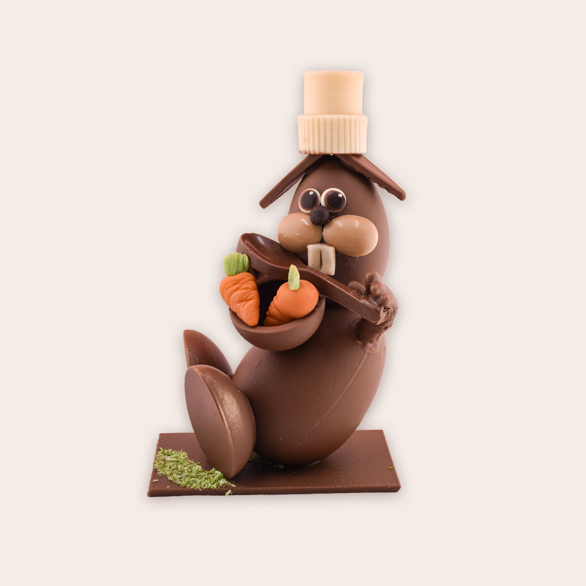 Une création unique entièrement réalisée en chocolat lait 33.60%, façonnée avec passion dans nos ateliers.