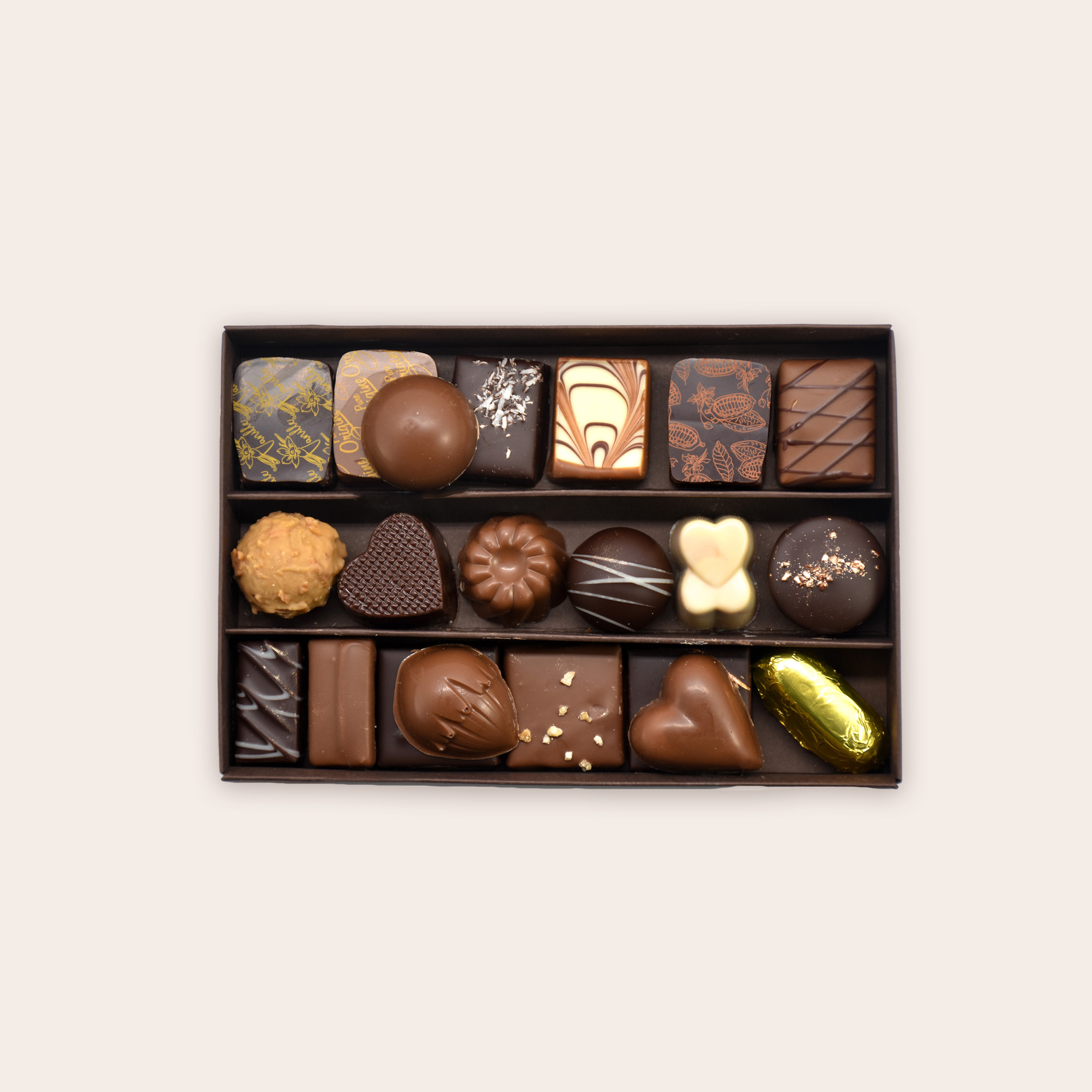 Nos écrins sont composés de différents pralinés et ganaches, noir, au lait ou blanc. Ils sont agrémentés de truffes, chocolats liqueur, rochers et orangettes.