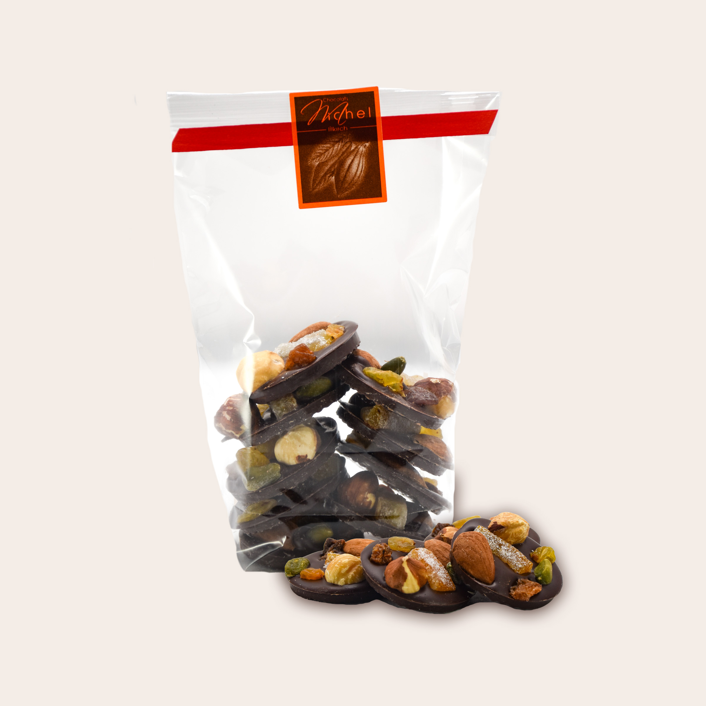 La richesse du chocolat noir sublimée par un assortiment de fruits secs et confits pour une gourmandise authentique.