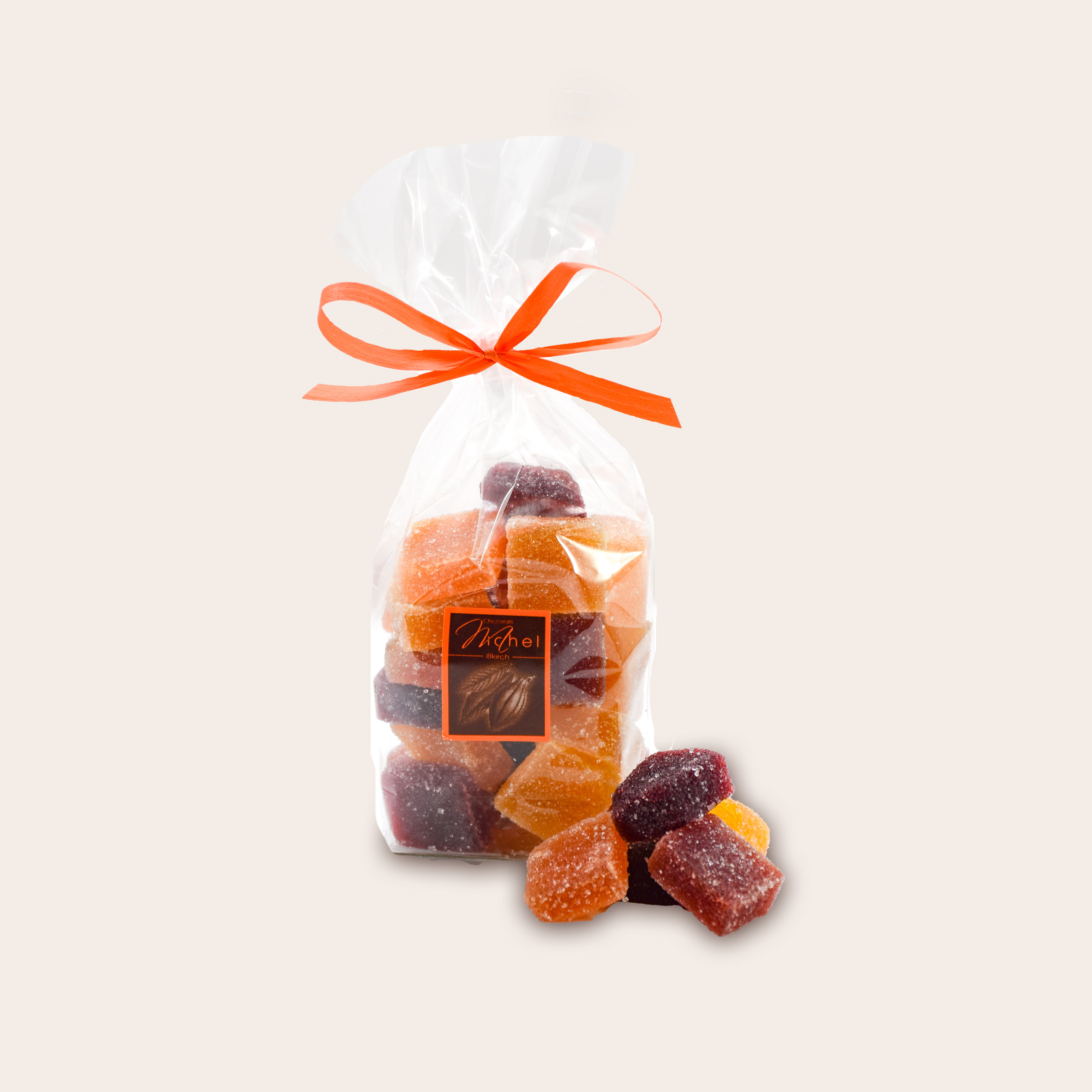 De tendres carrés fruités aux parfums intenses : fraise, framboise, myrtille, abricot, litchi, fruits exotiques, griotte, mandarine, quetsche, orange sanguine ou encore citron…