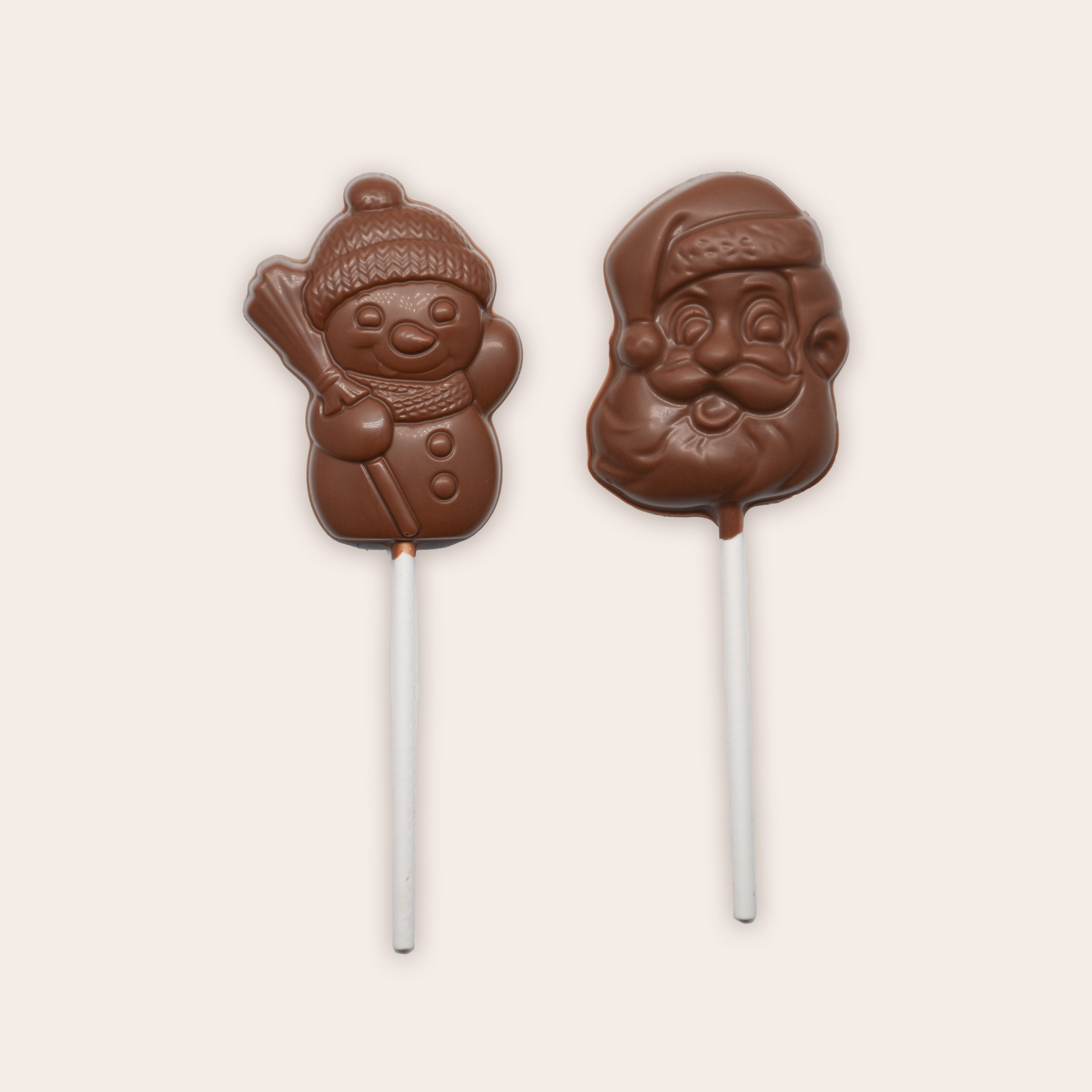 De jolies sucettes en chocolat au choix : Père Noël ou Bonhomme de Neige.