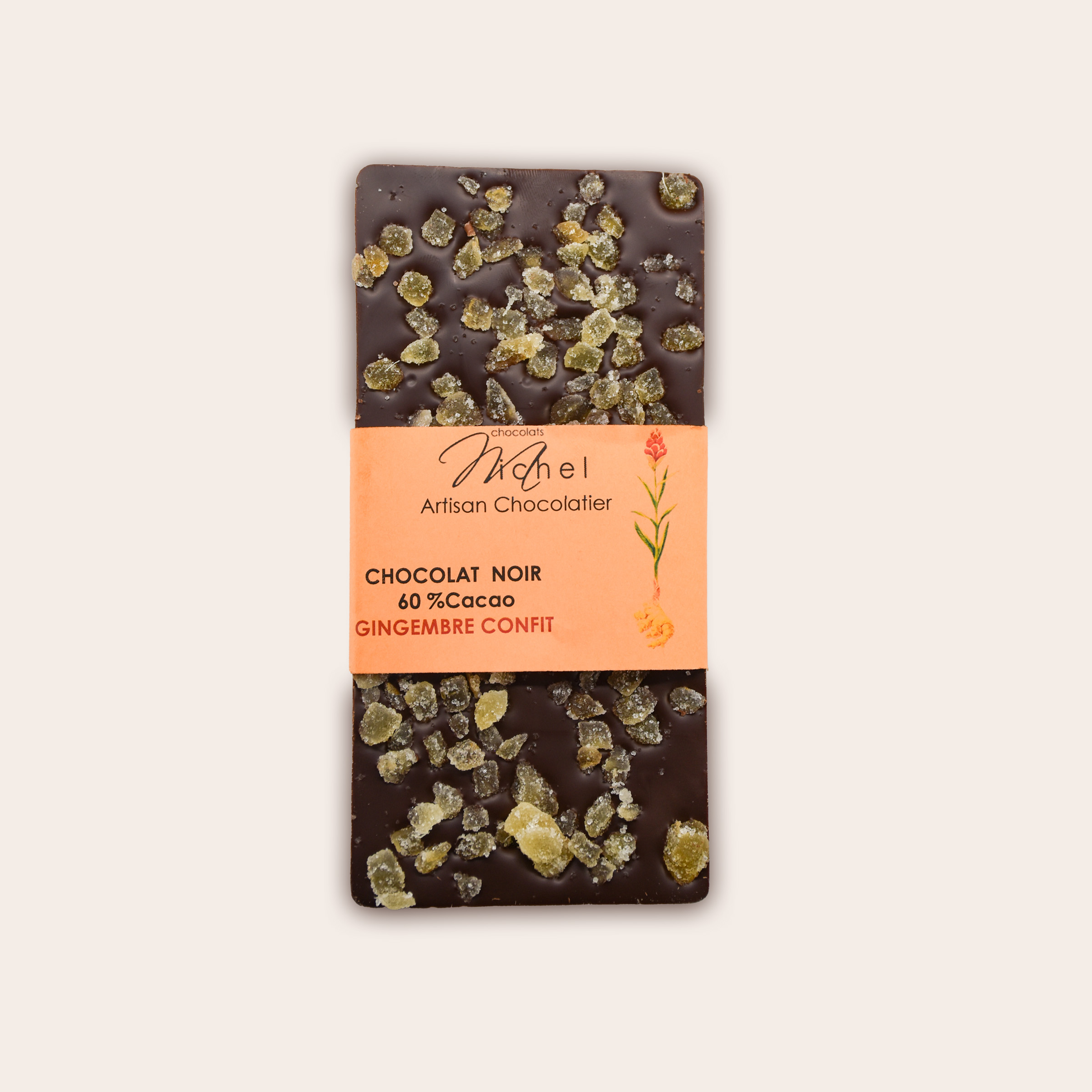 Cacao : 62 % minimum, pâte de cacao, sucre, beurre de cacao, émulsifiant : lécithine de soja. Garniture 18% : gingembre confit Peut contenir des traces de gluten, arachide, fruits à coquesConservation :